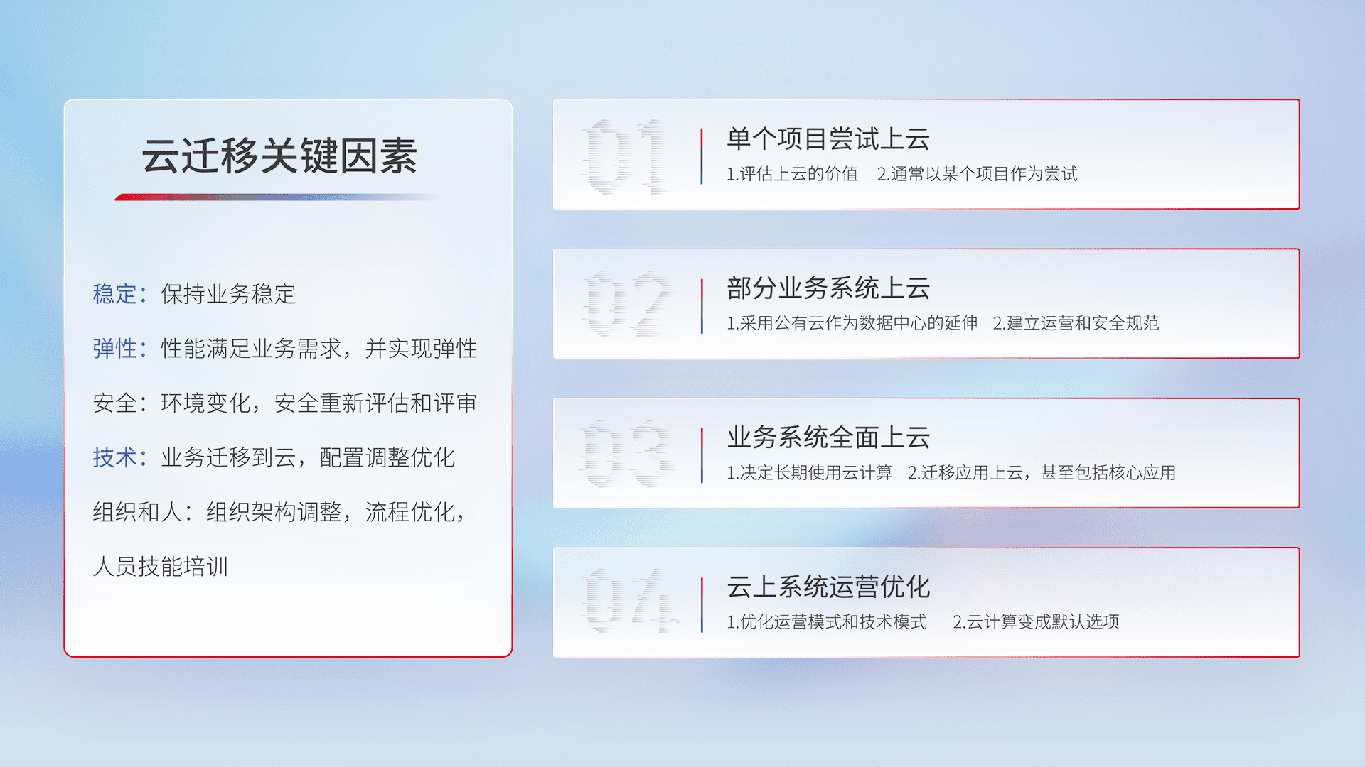 结合实际业务,,从规划设计、、云平台选型、、云原生改造、、、、数据迁移、、、、集成交付,,,,迁移全过程为客户识别最佳上云路径,,做好风险识别管理,,,,设计网络架构、、、身份权限、、安全审计合规、、操作审计、、日志审计、、、监控告警策略、、、多站点容灾设计等,,对云上基础设施进行整体规划,,,提升IT治理水平,,以满足弹性、、、、高可用、、高性能的需求。。。。